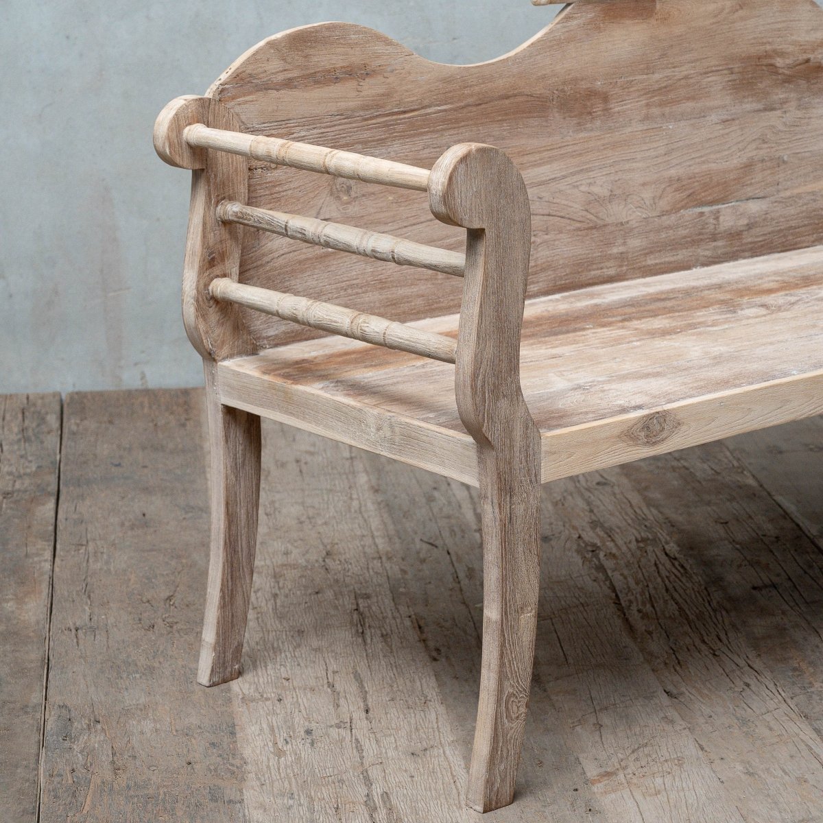 The Byonis Bench with Arm, crafted from reclaimed teakwood, features a turning design, tapered legs, and a cream white finish. Perfect for outdoor spaces, living rooms, home gardens, or offices, it brings both style and comfort.