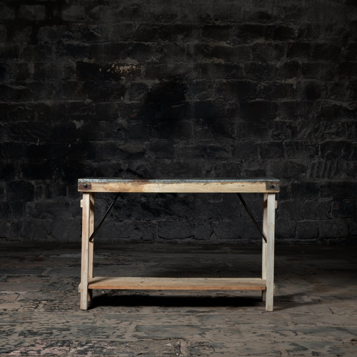 Really great console table. Super well-made, easy to assemble, secure packaging, arrived quickly. I love the simple ‘primitive’ design—reclaimed wood, iron fittings, and beautiful weathered patina on the metal top. Great accent for my hallway.