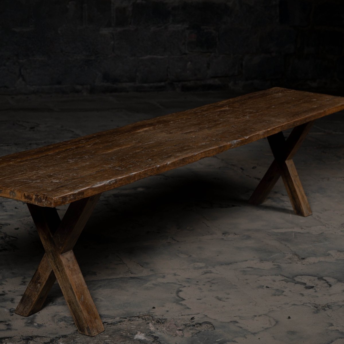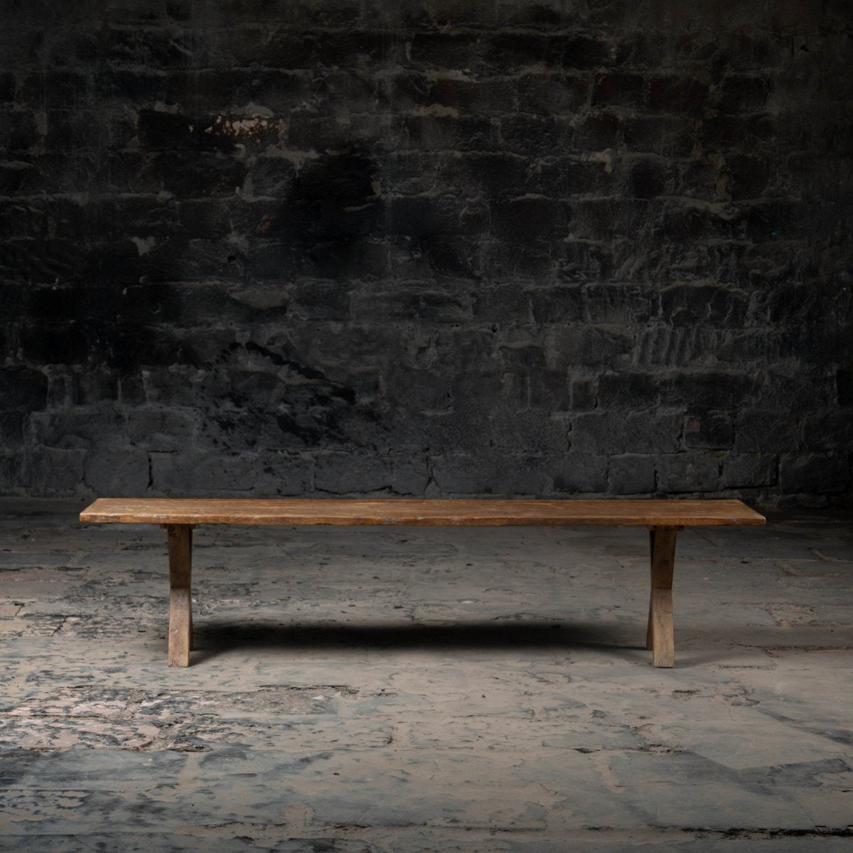 Statement Seating: Whether you’re hosting a dinner party or welcoming guests into your home, this old brown wooden bench makes a striking statement. Its classic cross-legged design and weathered finish seamlessly blend rustic charm with modern elegance.