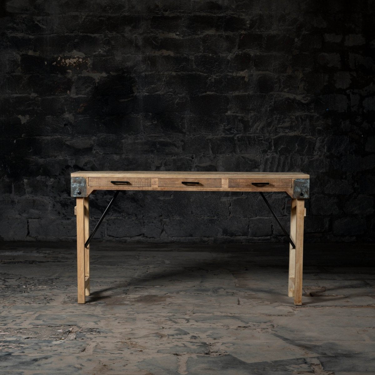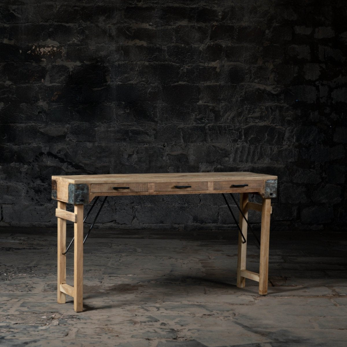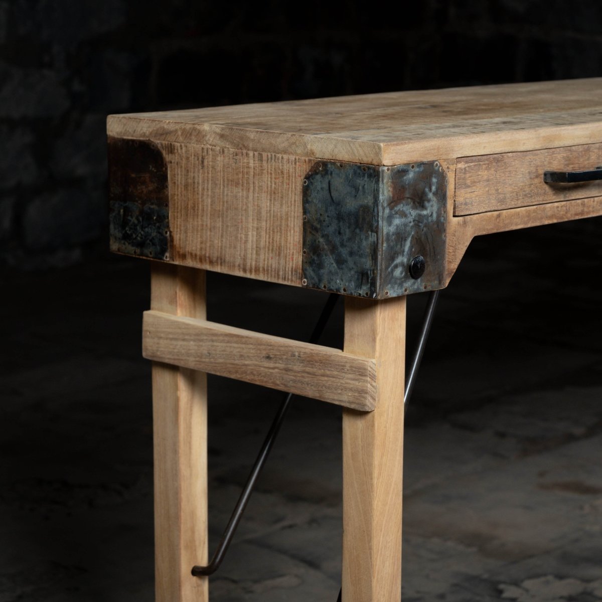 The console combines a solid hardwood top—such as sustainably sourced oak, teak, or sheesham—with a powder-coated steel frame inspired by industrial hinge design. This pairing delivers the natural warmth of real wood and the architectural strength of metal, creating a console table that is as durable as it is beautiful.