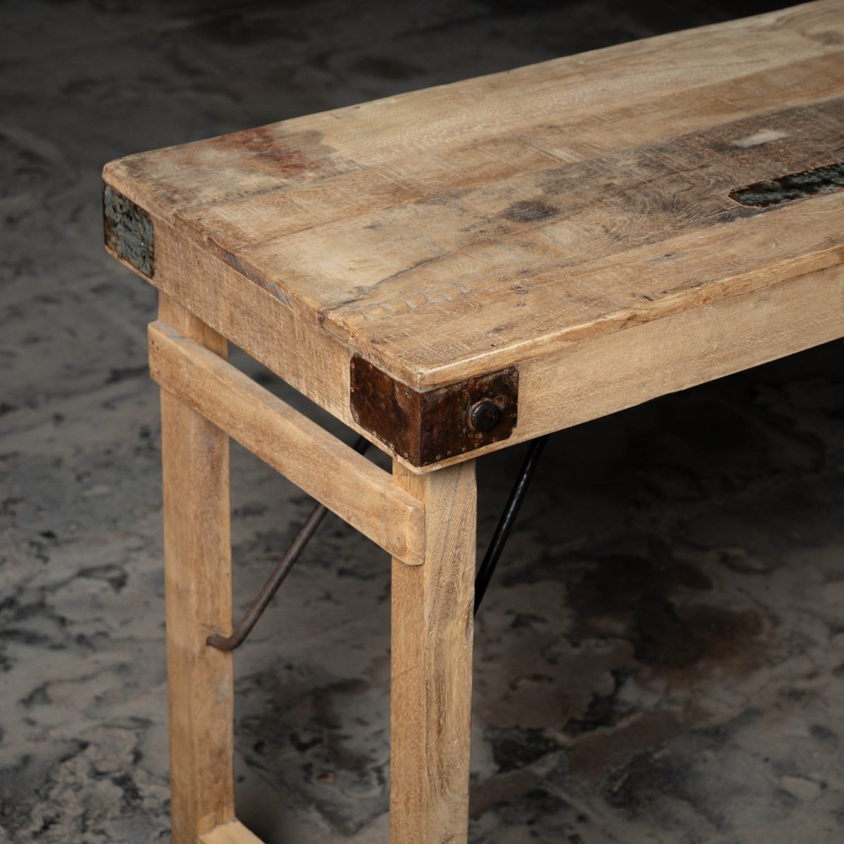 The Haven Hinge Console Table is expertly crafted from reclaimed wood, giving it an authentic rustic texture. Each table may feature grain variations, knots, nail holes, and unique weathered markings—these natural imperfections enhance its character and one-of-a-kind charm.
