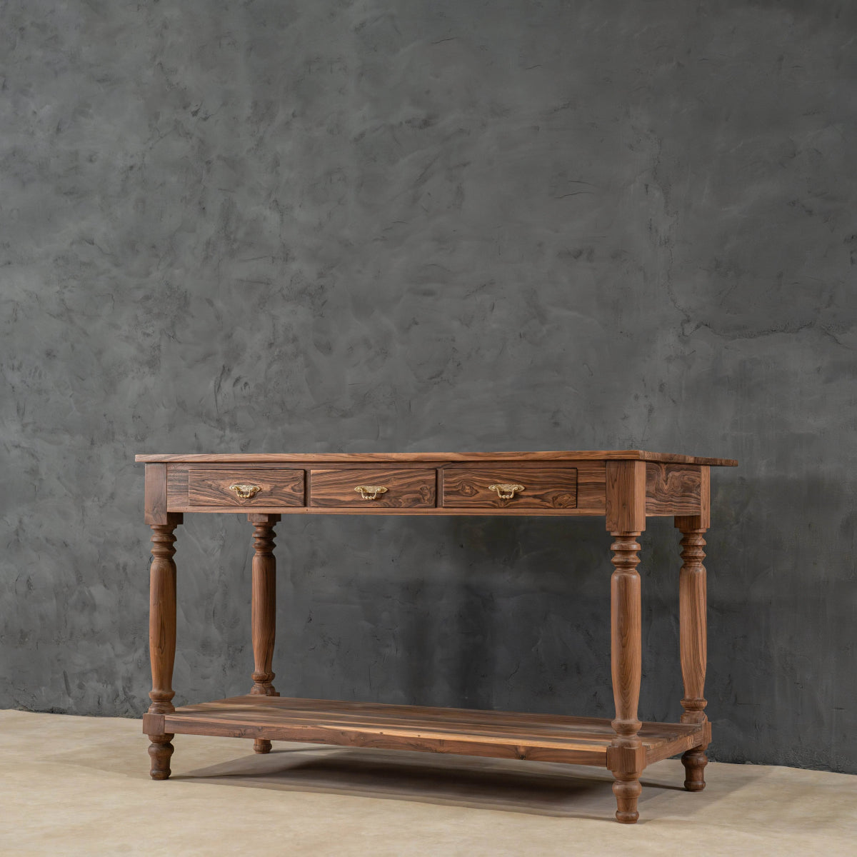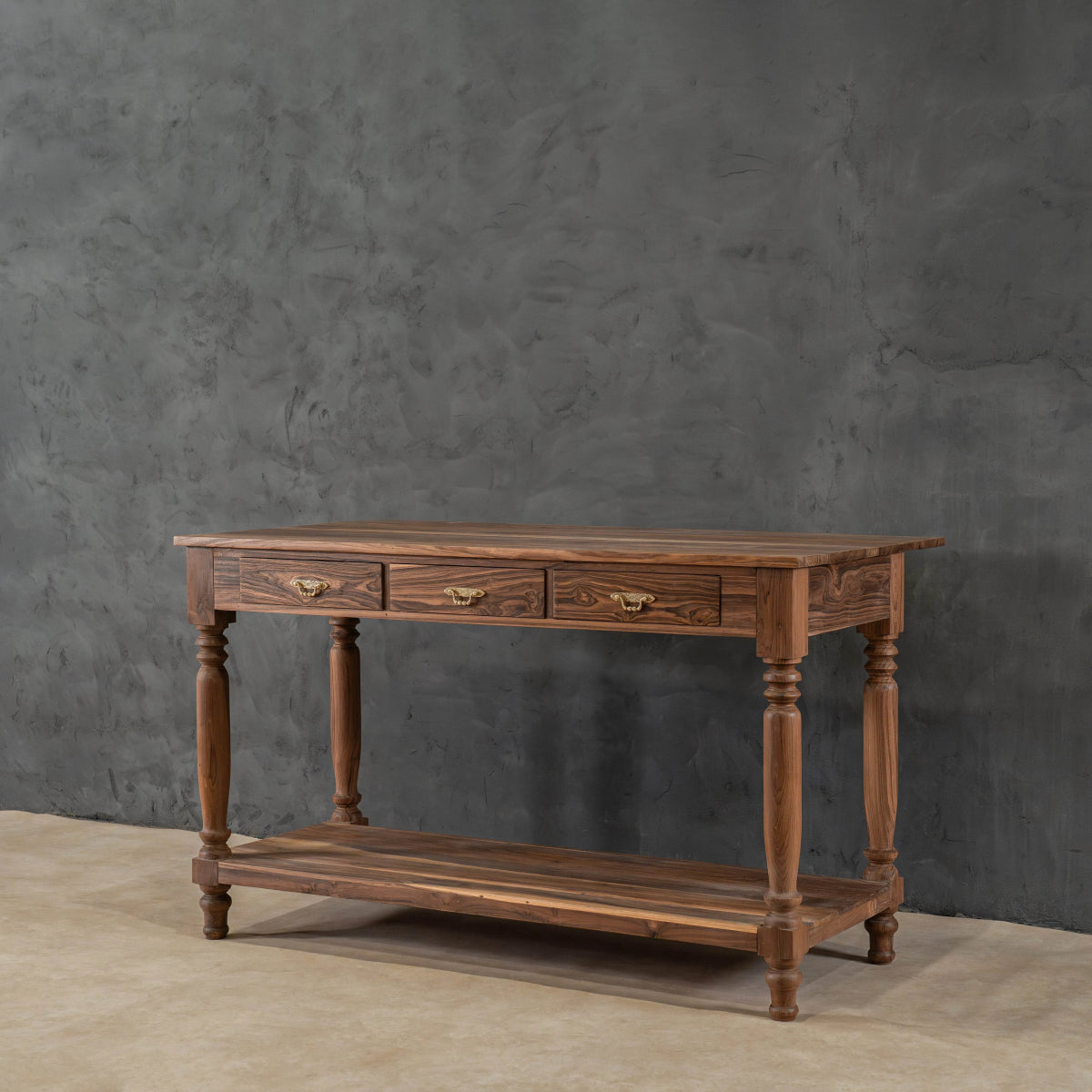 Meet the Jero Kitchen Counter Table by The Vintage Realm, a sophisticated fusion of style and storage designed for modern kitchens. This reclaimed teak wood counter table combines a generous work surface with an integrated back extension, drawer, and shelf—perfect for counter-height dining, meal prep zones, or functional kitchen islands. With its blend of organization and rustic elegance, the Jero solves space challenges while looking stylish.