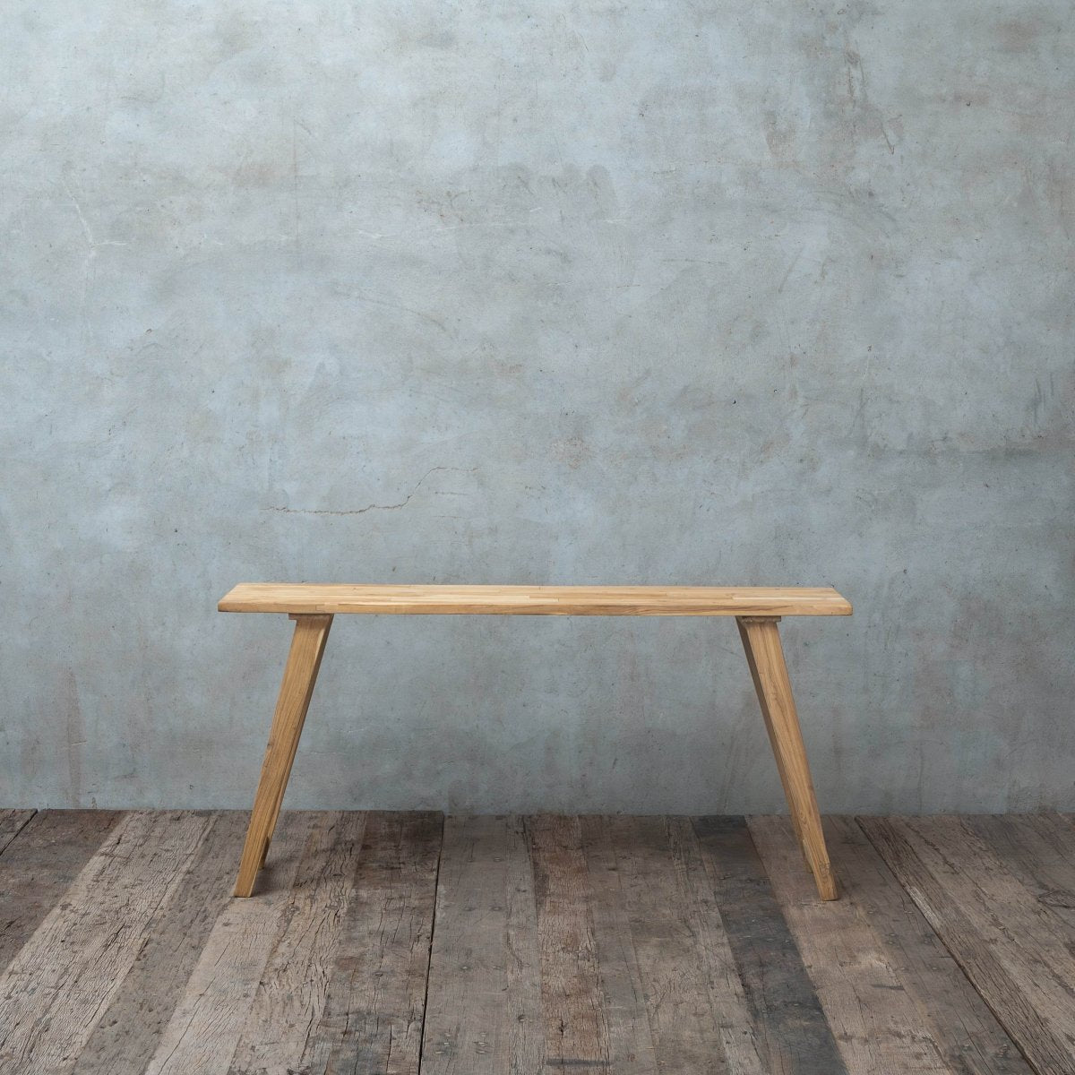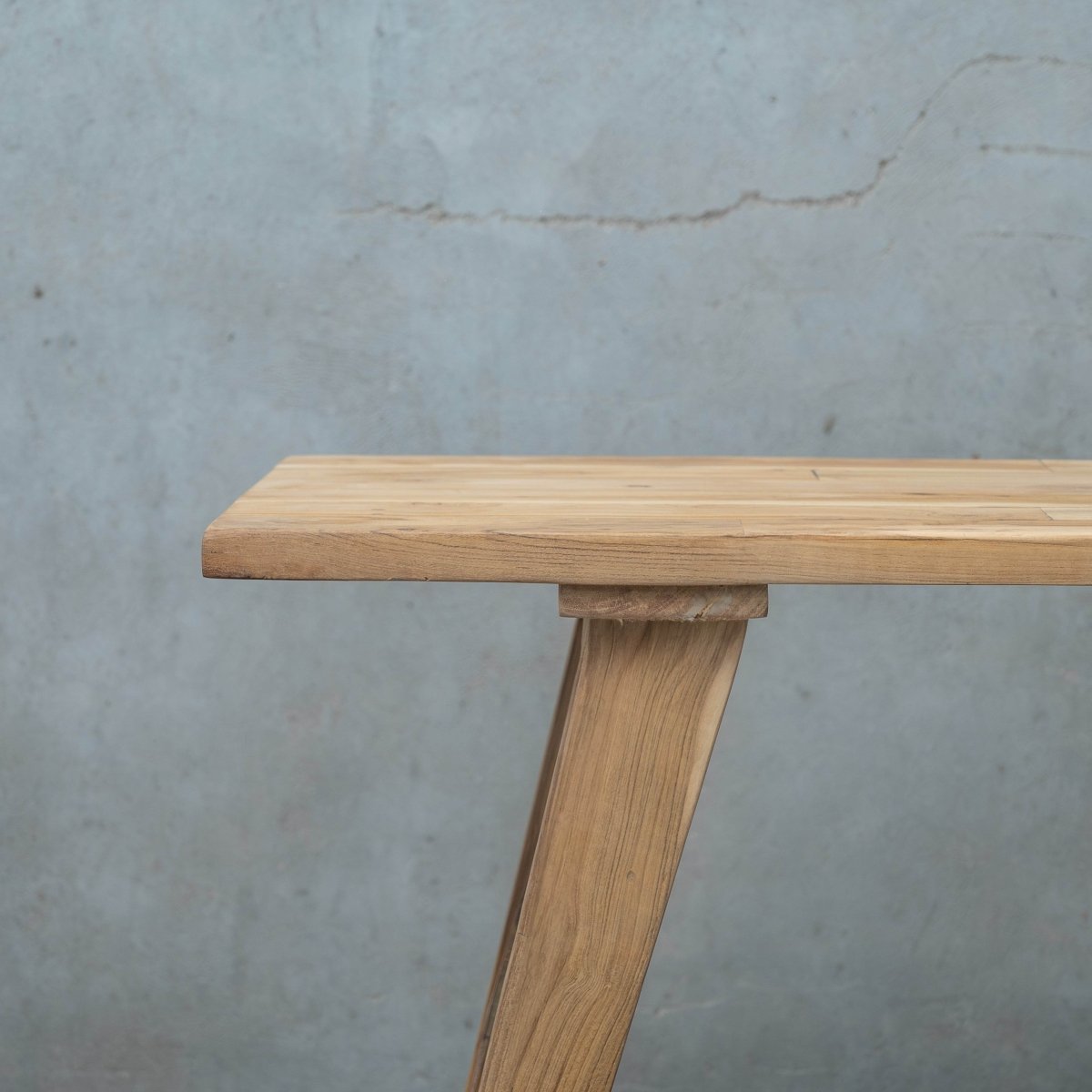 The Liova Console Table, crafted from reclaimed teakwood, features a small plank top and tapered legs. With a light bleach finish, it’s a sleek and versatile piece, perfect for entryways, hallways, or living rooms.