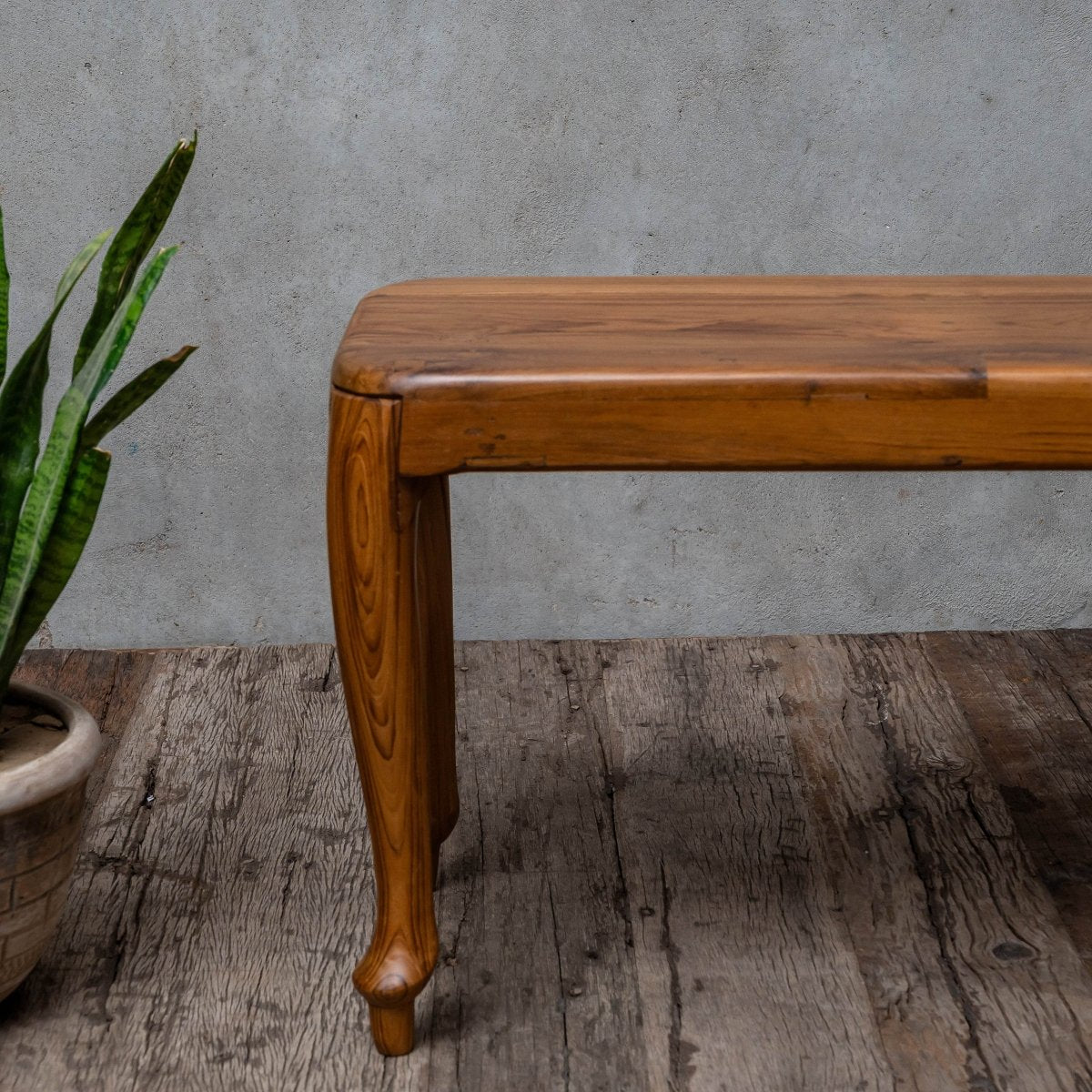 The Agro Dining Table with Bench, crafted from reclaimed teakwood, features vintage-inspired legs with a turned design and rounded edges on top. With a natural lacquer finish, it's a stylish and functional addition to dining rooms, kitchens, or living rooms.