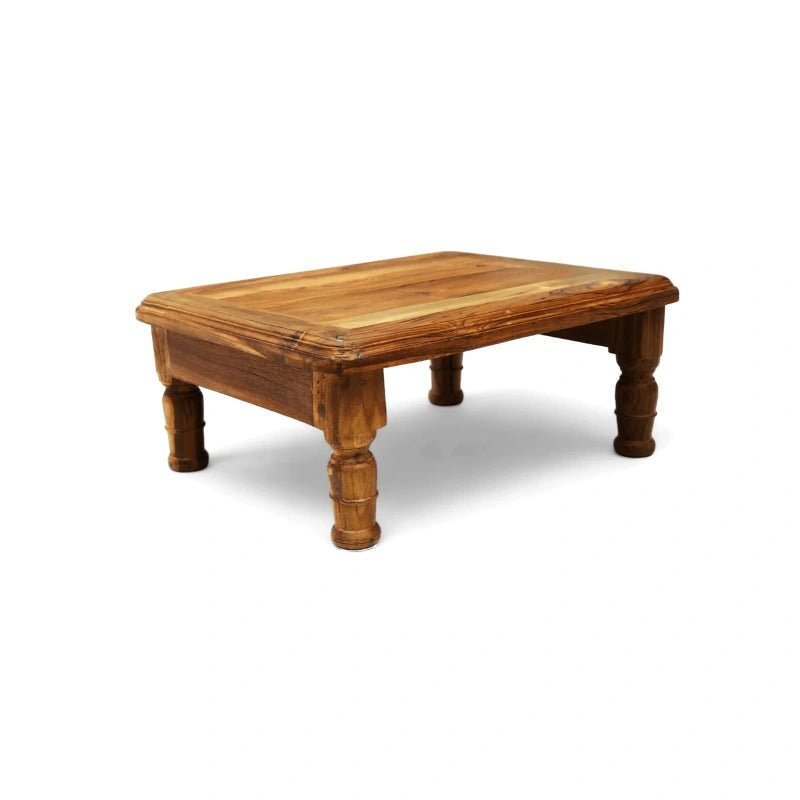 The Comfy Foot Rest Stool, crafted from reclaimed teakwood, features elegant turning legs and a natural lacquer finish. Perfect for adding comfort and style to your living room.