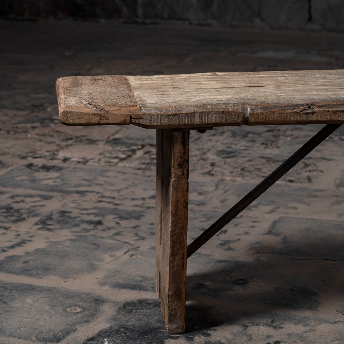 The bench features a raw finish, preserving the original patina and texture of the reclaimed wood. This finish highlights the natural beauty and imperfections of the wood, giving each bench its own distinct character.